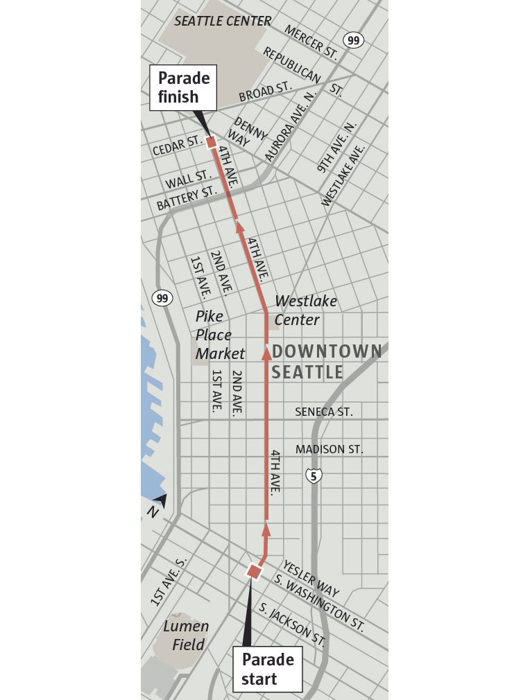 시애틀 시호크스 선수들이 파이오니어 스퀘어에서 시작해 시애틀 센터 인근의 4번 애비뉴까지 슈퍼볼 우승을 기념하는 화려한 퍼레이드를 진행합니다. 루멘 필드에서 열리는 공식 행사에는 일반 관람객 입장이 제한됩니다.