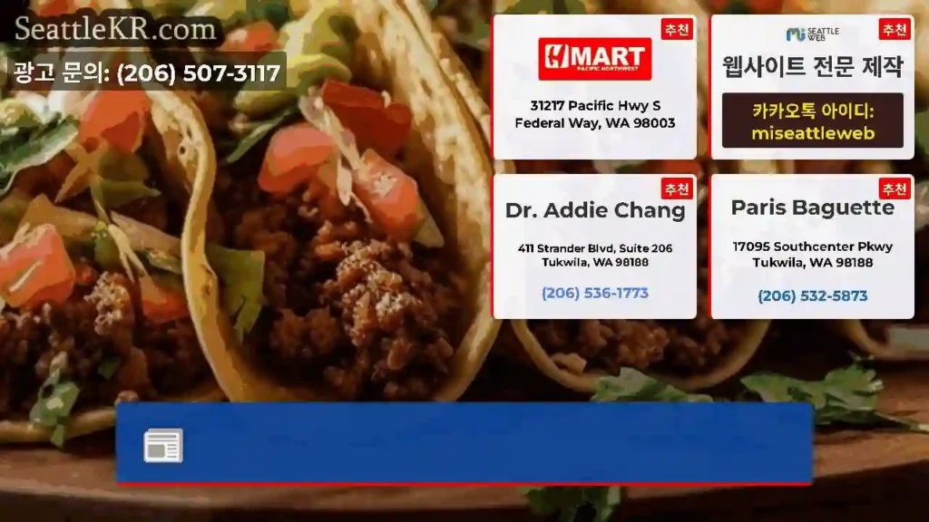 2025.10.07 10:53시애틀 교통뉴스시애틀KR 시애틀 … 더보기시애틀KR시애틀 교육 | 시애틀 여행 | 시애틀 맛집시애틀 추천 링크페이스북 트위터 인스타그램최신 뉴스스타벅스 워싱턴주서 수백명 해고 결정화요일 아침 폴스보에서 두 명이 사망한 채 발견된 후 경찰은 파울 플레이를 의심하고공항 웨이 S & S 로얄 브로엄 웨이에서 충돌 사고에 대한 시각적 보고만 있습니다.트럼프 대통령은 “후불금은 우리가 누구를 이야기하느냐에 달려 있다”고위기 치료 센터 논란 투표 개시노스다코타 토네이도 EF5로 격상된 비밀 밝혀져조쉬 네일러 매리너스 라인업 합류!이번 내셔널 타코 화요일에는 10월 7일 화요일에 여러 레스토랑에서 할인 및 무료 혜택을SR 167 다리 수리 내년까지 지연
